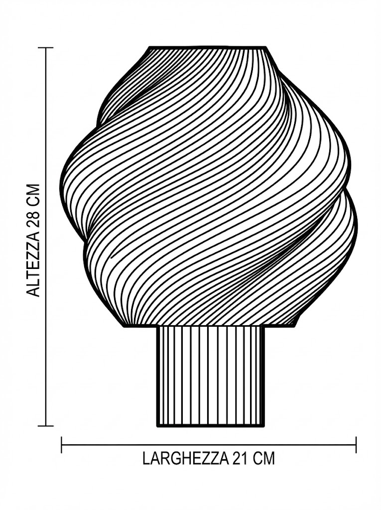 Questa lampada si presenta come un oggetto di luce e contemplazione, dove la funzione incontra l’arte. Il volume superiore, modellato da una spirale continua e armoniosa, evoca il movimento naturale dell’aria e dell’acqua, trasformando la luce in una presenza viva, quasi respirante. Le sottili scanalature della superficie creano un raffinato gioco di chiaroscuri, amplificando la profondità visiva e la sensazione di leggerezza.