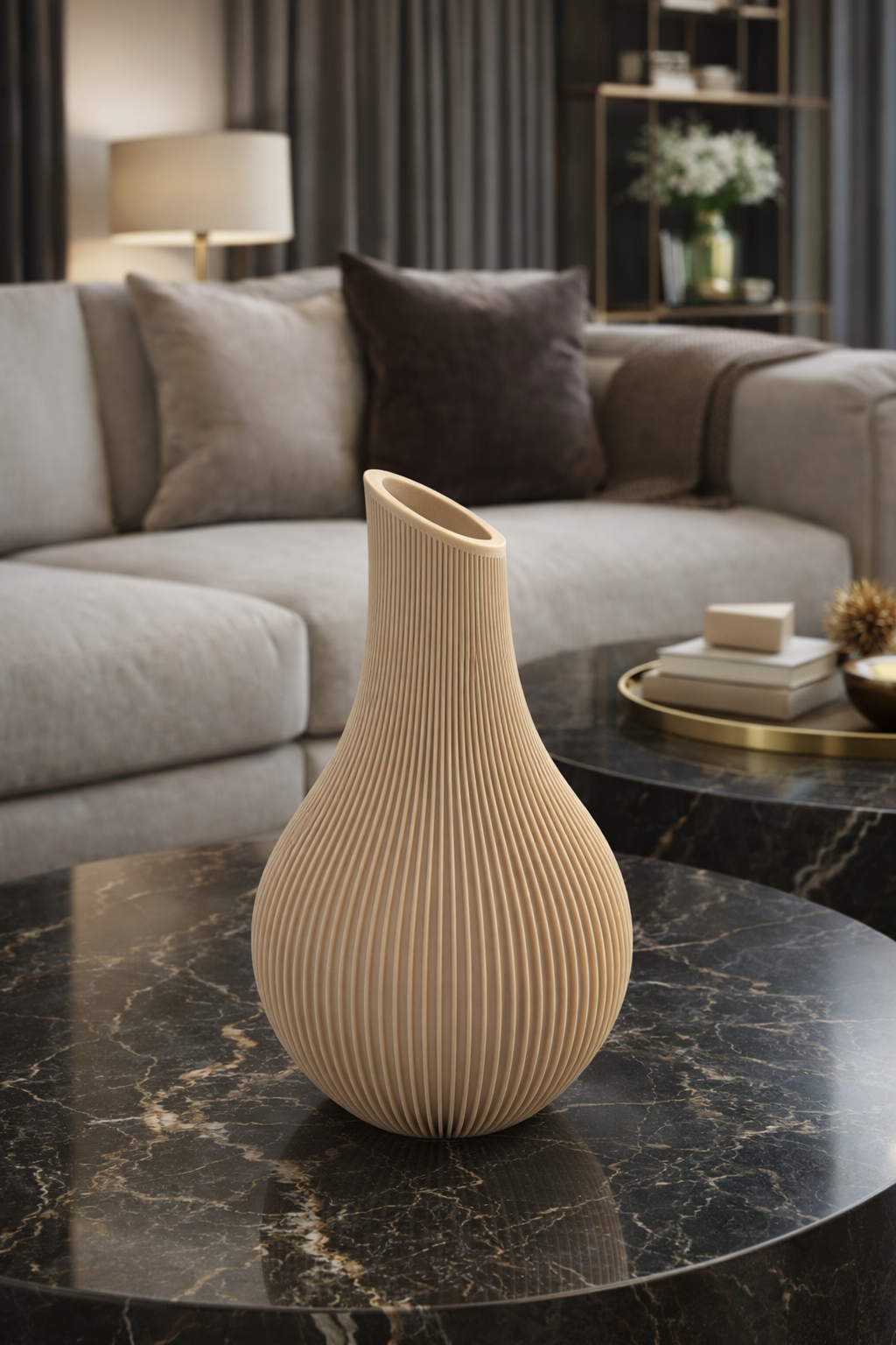 Le scanalature sottili accompagnano una silhouette morbida e bilanciata, capace di imporsi con discrezione nello spazio.
